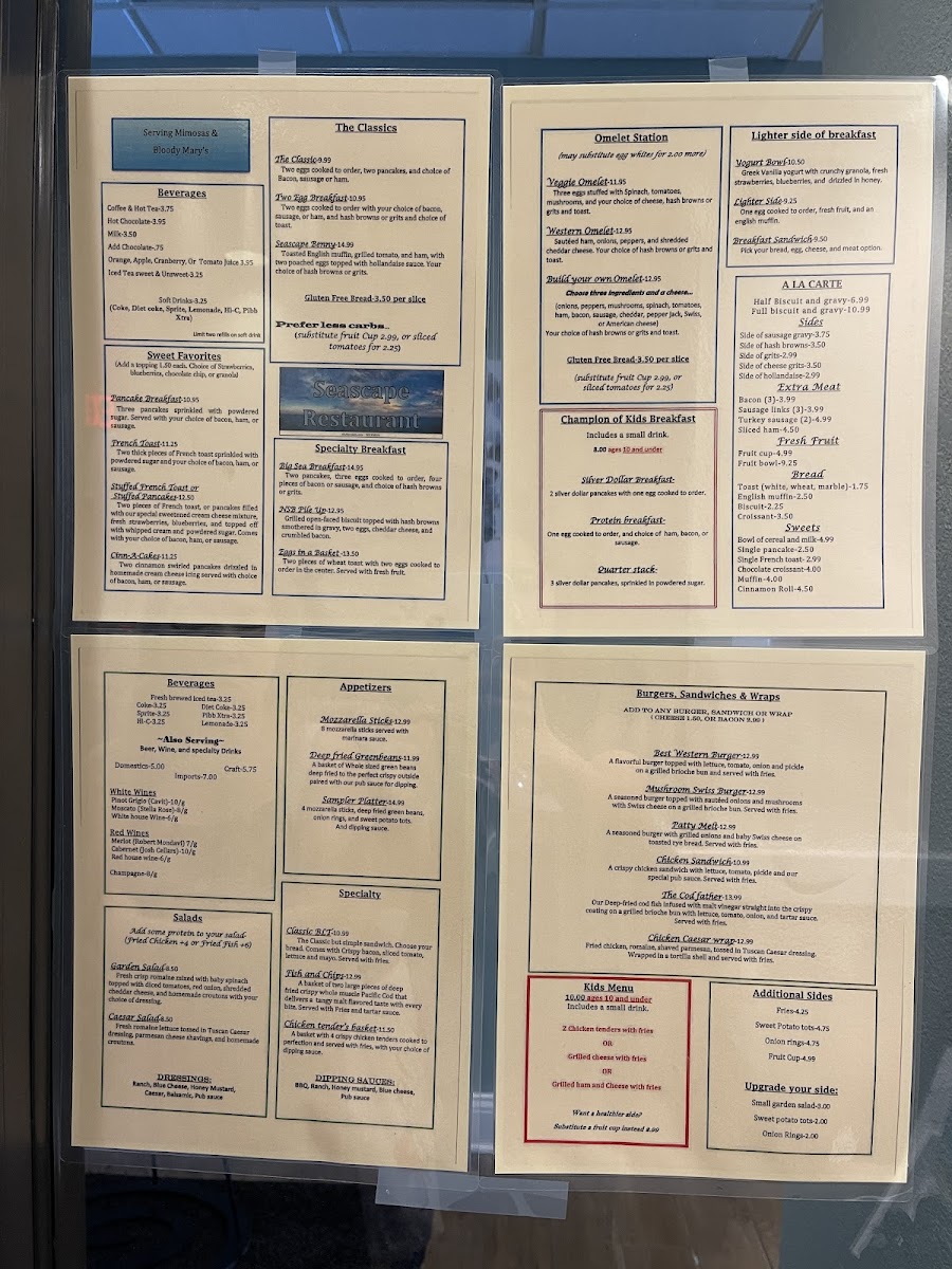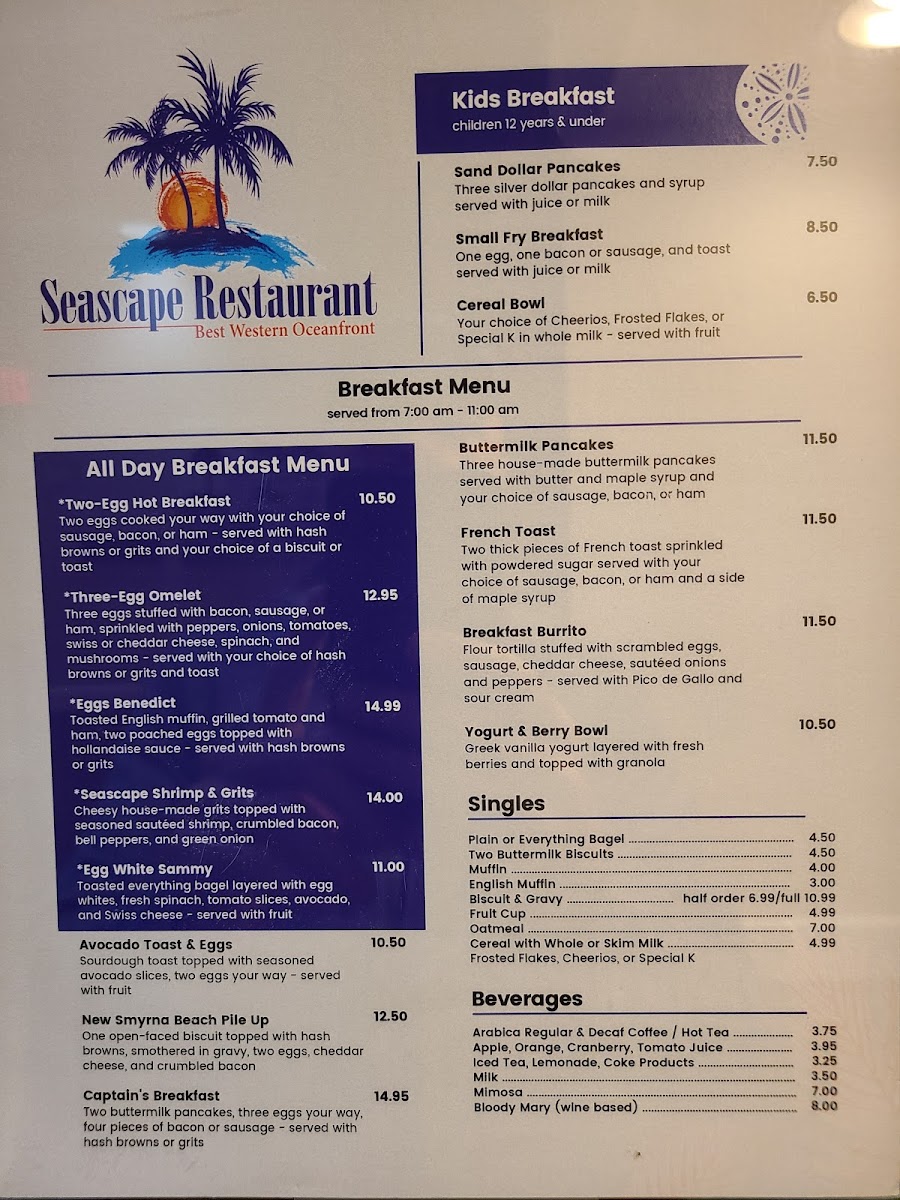 The Seascape Restaurant Menu offers a delightful mix of fresh, flavorful dishes that perfectly capture the essence of coastal dining. Located right on the stunning New Smyrna Beach, it serves as the ideal spot for those looking to enjoy a relaxed meal with an ocean view. Whether you're craving seafood or looking for something with a bit of a twist, the menu features a variety of options that will leave you coming back for more. From the light and zesty appetizers to the hearty entrées, there's something to satisfy every craving. Don’t forget to try the signature dishes that highlight the best of local flavors, and be sure to pair your meal with a refreshing drink from their extensive beverage selection. Whether you're enjoying a casual lunch or a special evening out, the Seascape menu is crafted to offer a memorable dining experience.